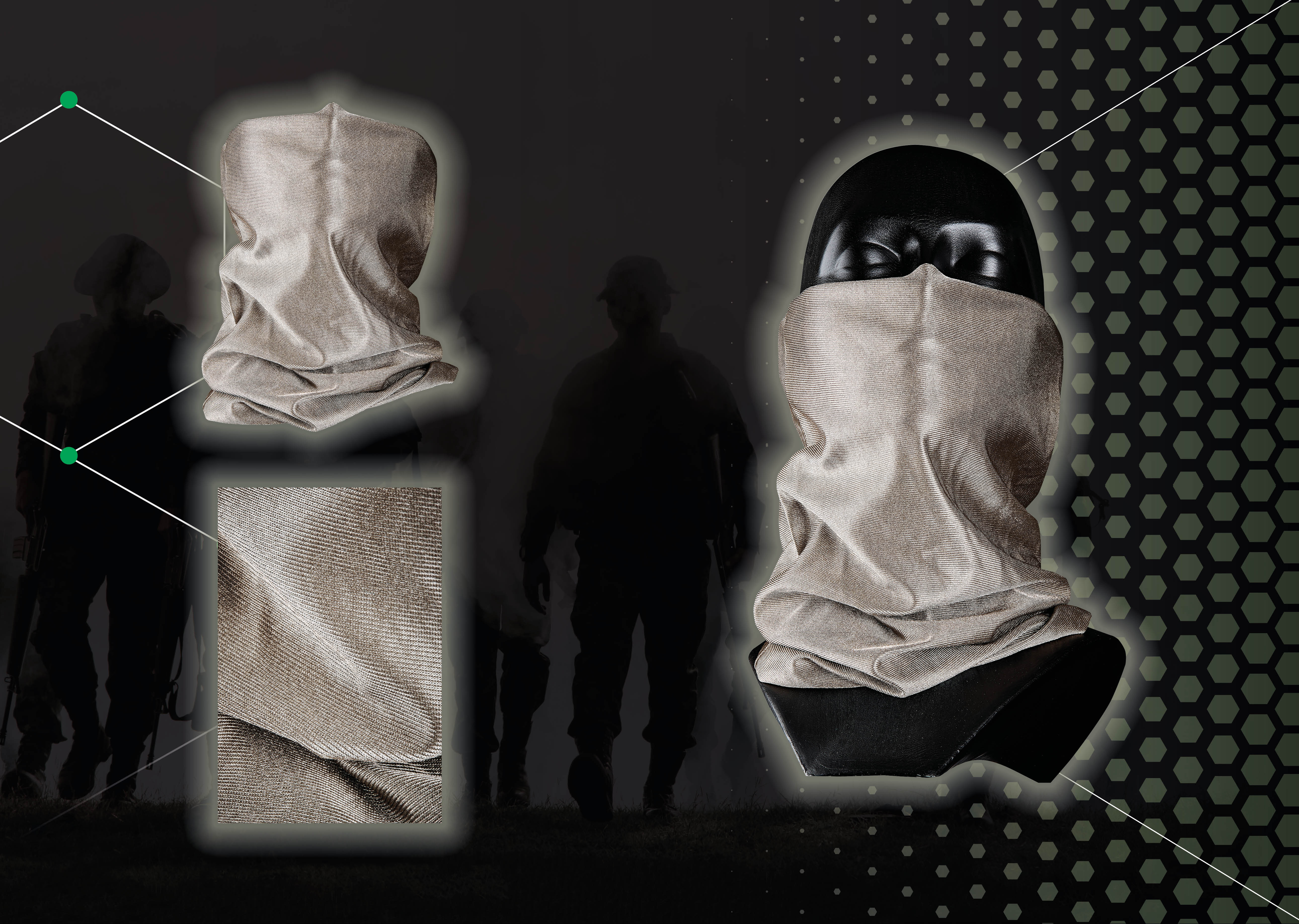InfraGaitor is an ultralight multispectral neck gaiter made from an elastic knit engineered to reduce the thermal signature of the face and neck. The textile modulates IR reflectivity and helps suppress prominent hotspots that typically appear around the mouth, nose, and forehead on modern thermal imagers. The knit is breathable, self-sterilizing, and comfortable for all-day wear. Its tubular construction adapts to various face shapes and is fully compatible with helmets, eye protection, comms headsets, and ballistic gear.