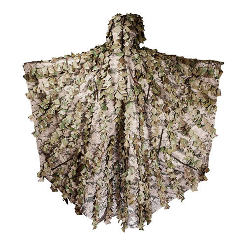 It works purely passively—with no electronics and no power requirement—and creates conditions that make a person less visible to NIR imaging systems and thermal cameras. The material is quiet, water-resistant, and wind-resistant, making it suitable both for movement and for extended static observation. The poncho can also be deployed as a tarp to provide overhead concealment or shelter.