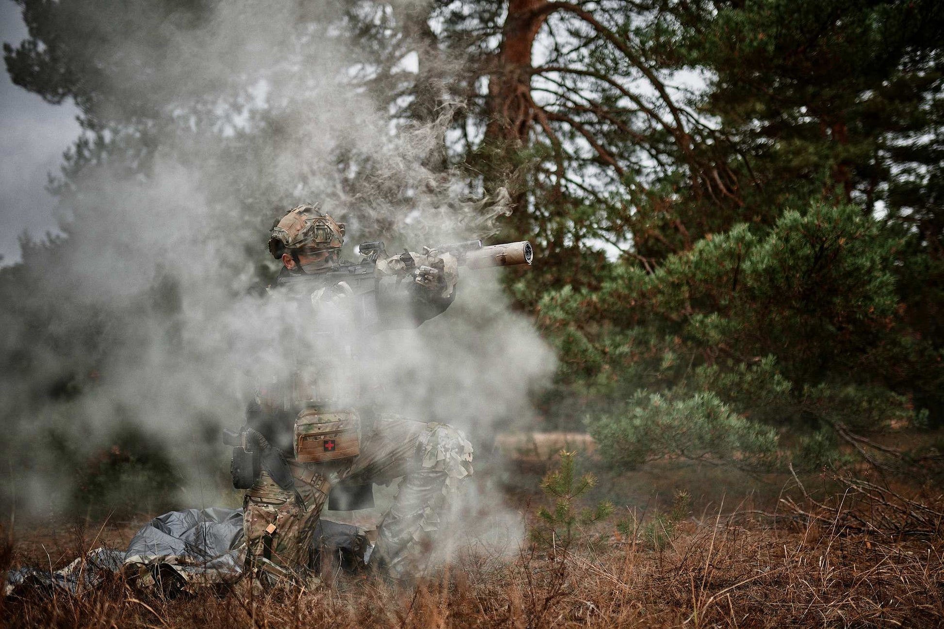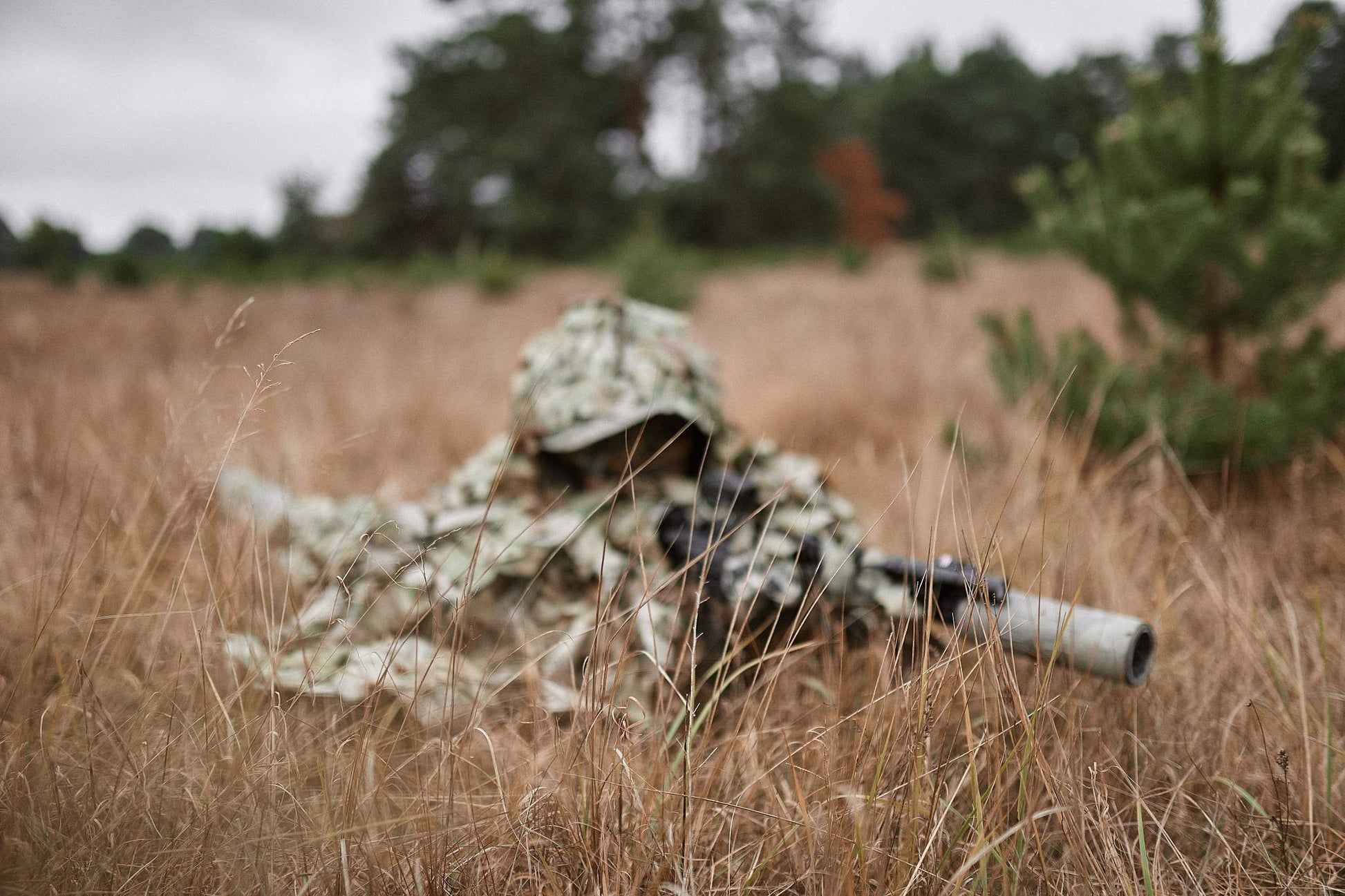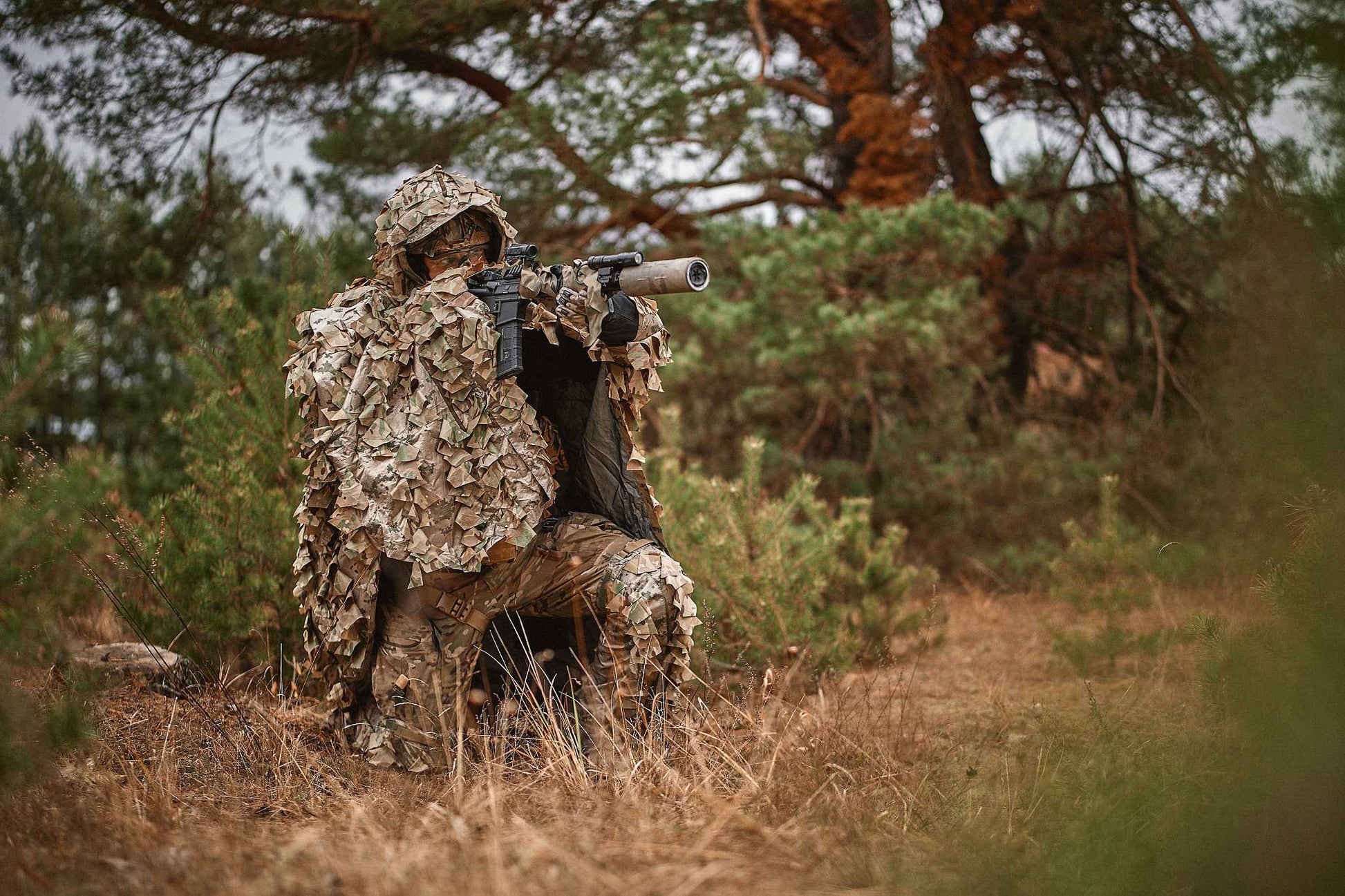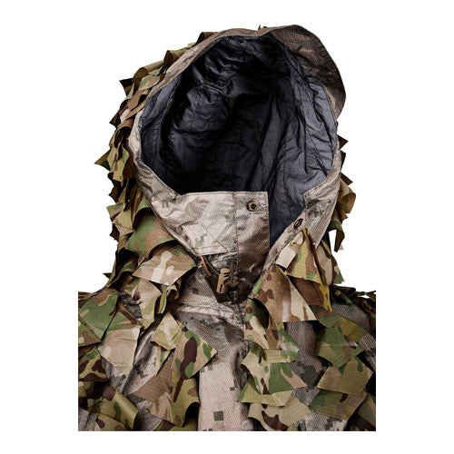 The construction is engineered to fit over full kit while maintaining immediate access to the weapon and magazines. InfraGhillie is carried in a dedicated MOLLE pouch, allowing rapid opening and instant deployment. The system includes leg and neck covers that reduce signature in transition zones and help smooth out the overall silhouette.