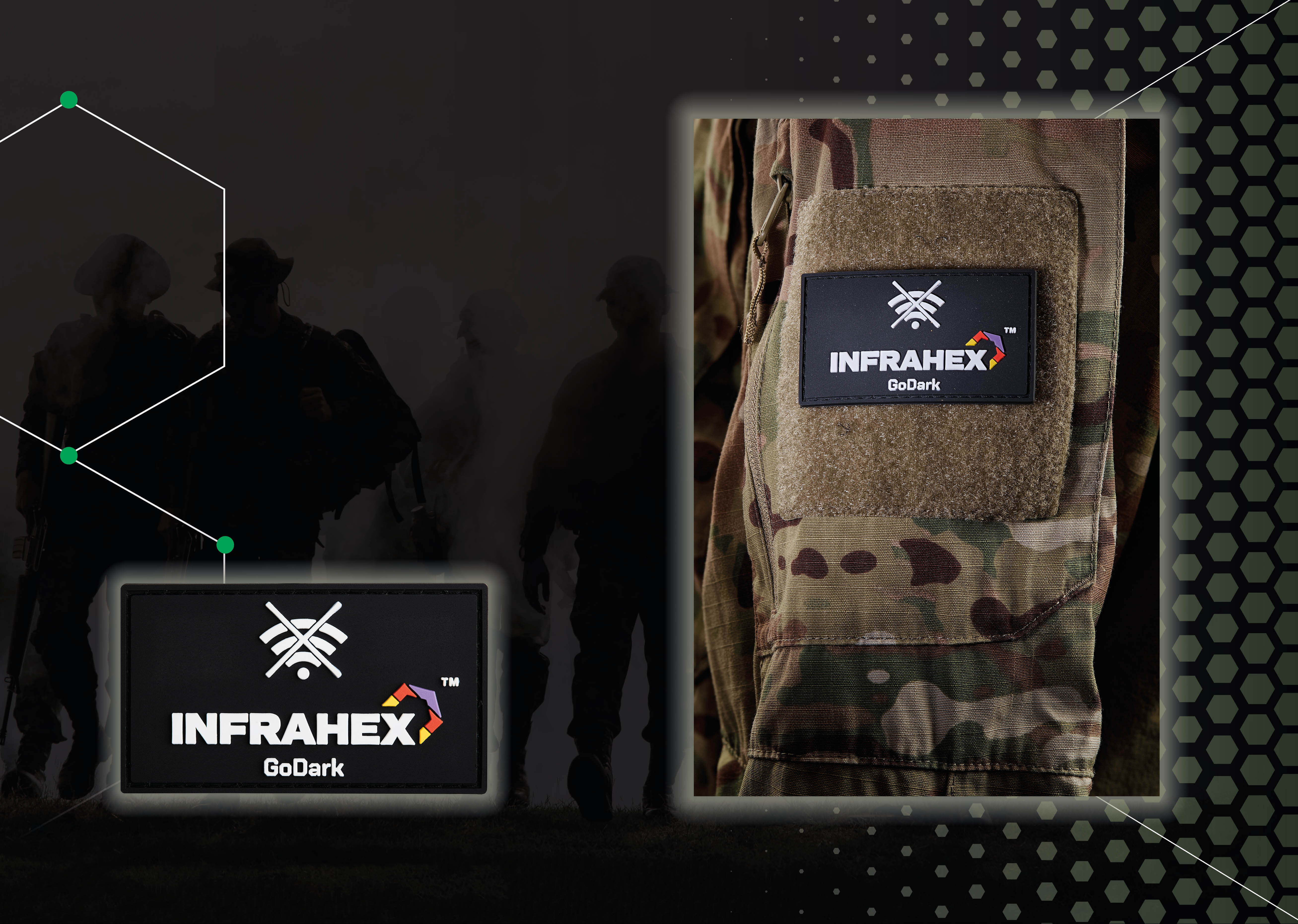 The InfraHex IntelPatch is a simple embroidered patch designed for vests, packs, and any standard loop panels.