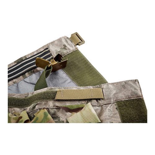 Each cover measures 60 × 80 cm and weighs 350 g. The full-length front hook-and-loop closure allows rapid donning without removing boots. The covers are secured using crocodile clips to the upper trouser area or belt and remain stable during running, crawling, and extended movement. A boot-under strap keeps the cover properly indexed at all times.