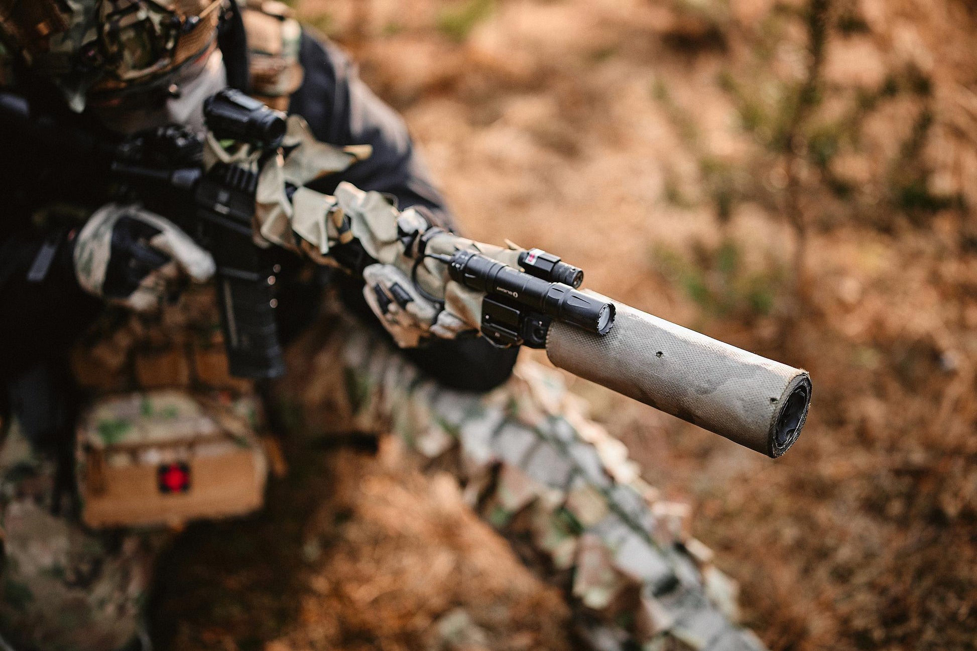SupCover Ti mounts using a custom-machined collar tailored to a specific suppressor model. This ensures a precise fit with no rotation and no interference with suppressor performance. In the field, that means easier handling during reloads, significantly lower thermal signature, and a cleaner sight picture when moving or engaging through optics. Compared to textile wraps, it offers far greater durability, higher heat tolerance, and superior behavior during rapid removal.